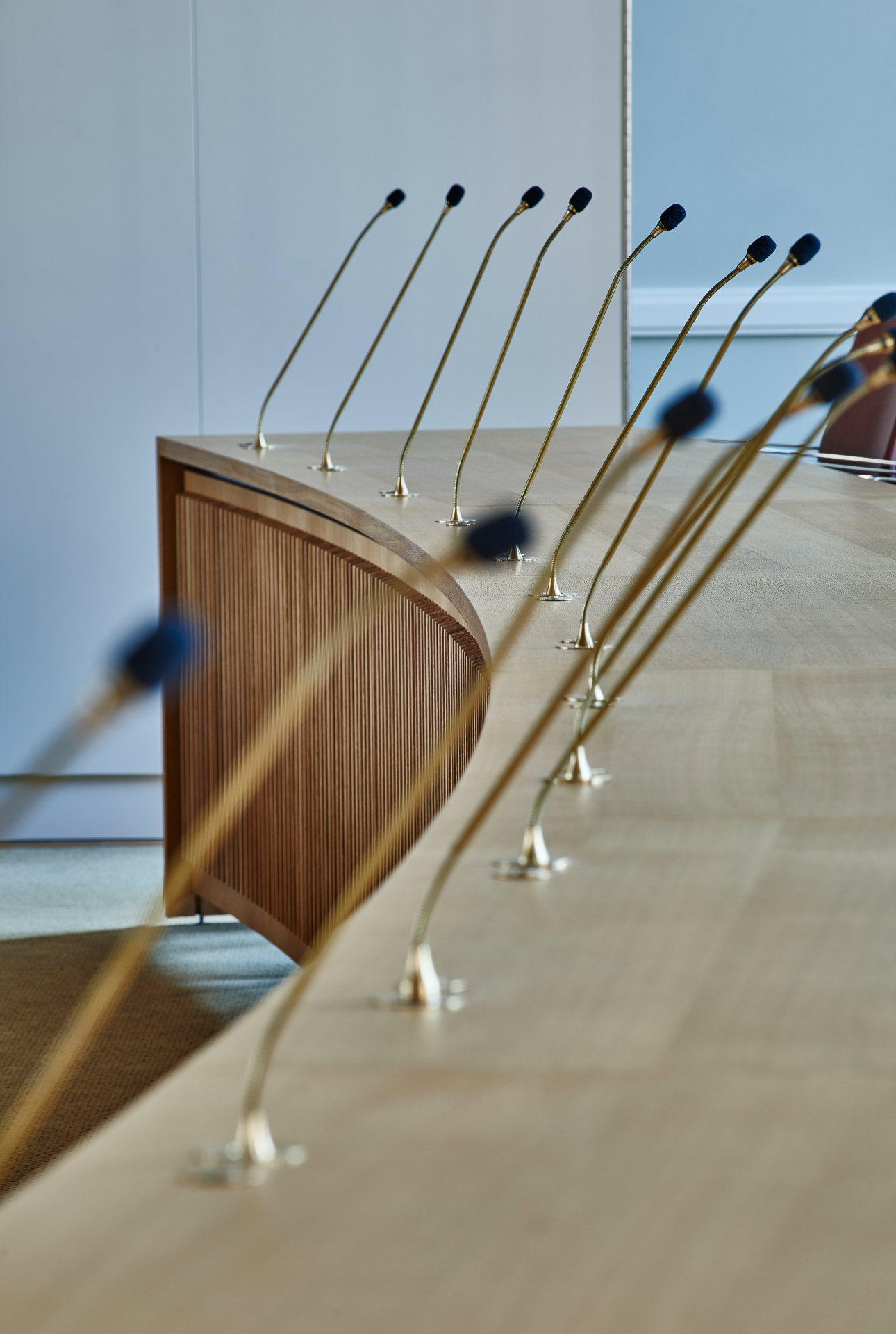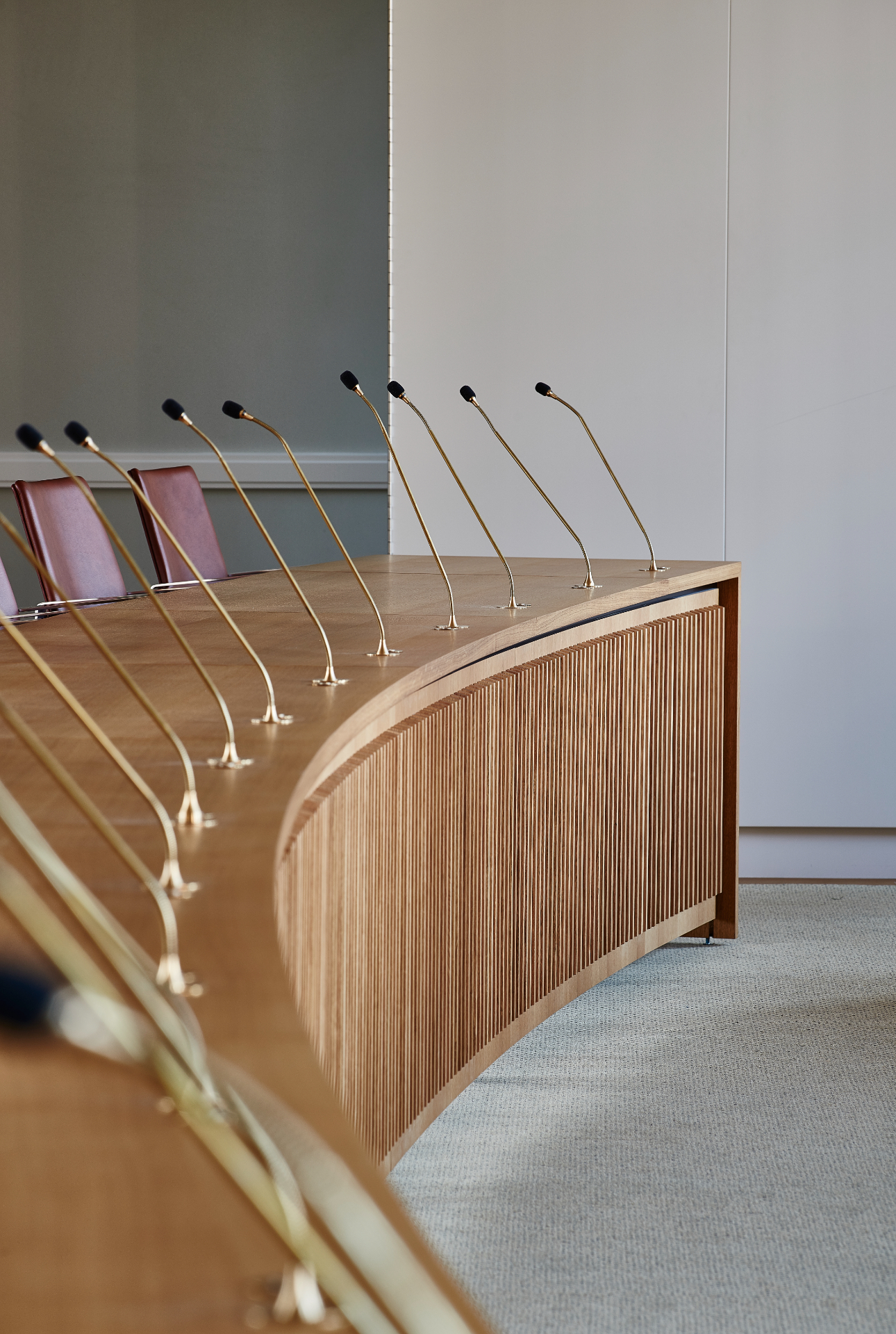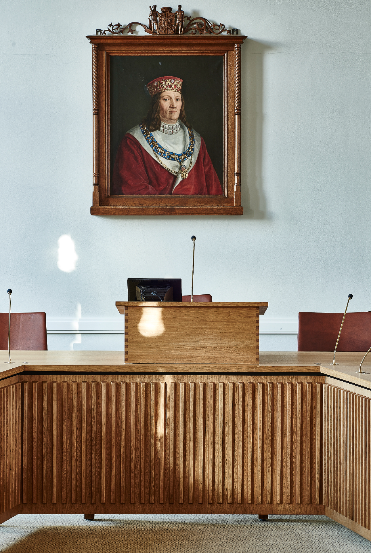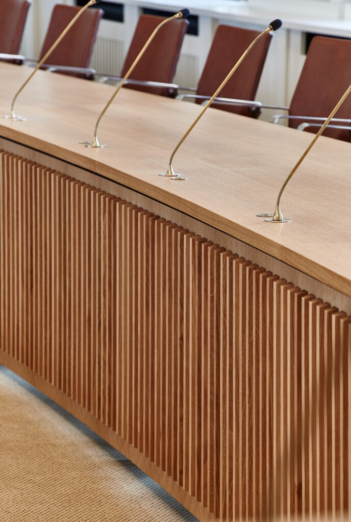 Det nye bord er udført i massiv eg og udformet med en elegant buet form, så alle byrådsmedlemmer har mulighed for at se hinanden under møderne.