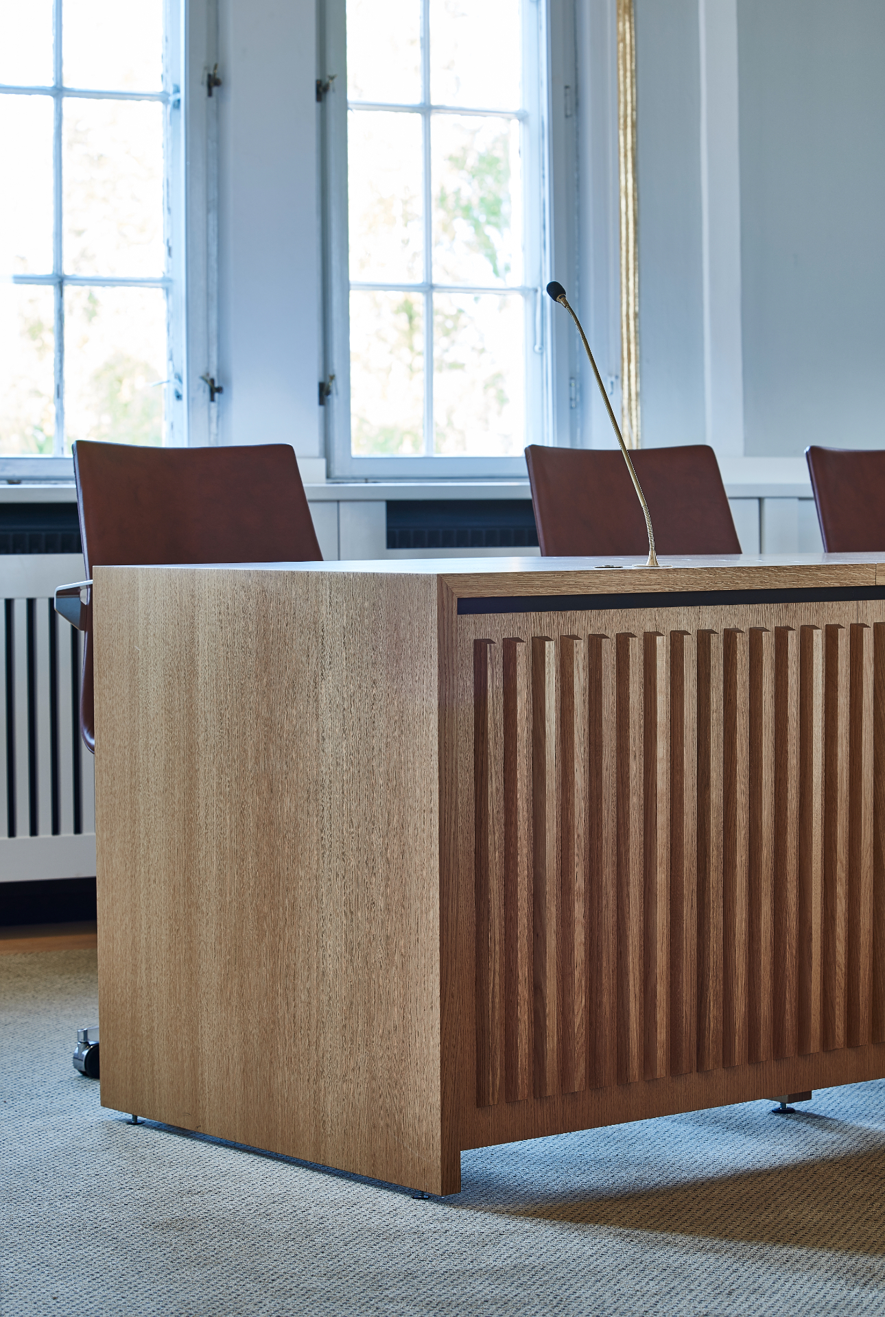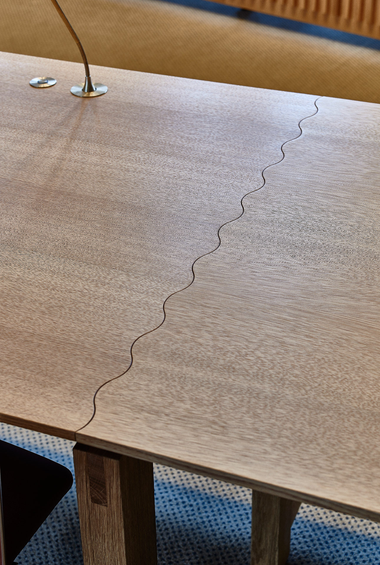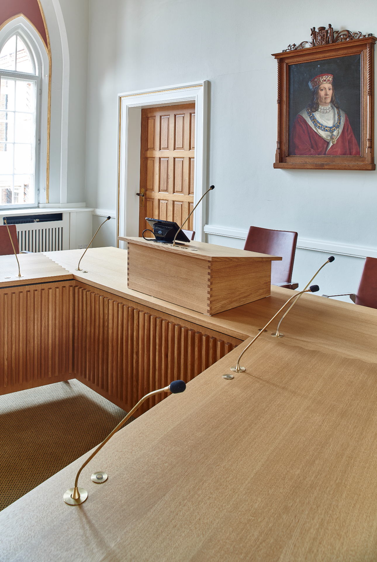Det nye bord er udført i massiv eg og udformet med en elegant buet form, så alle byrådsmedlemmer har mulighed for at se hinanden under møderne.