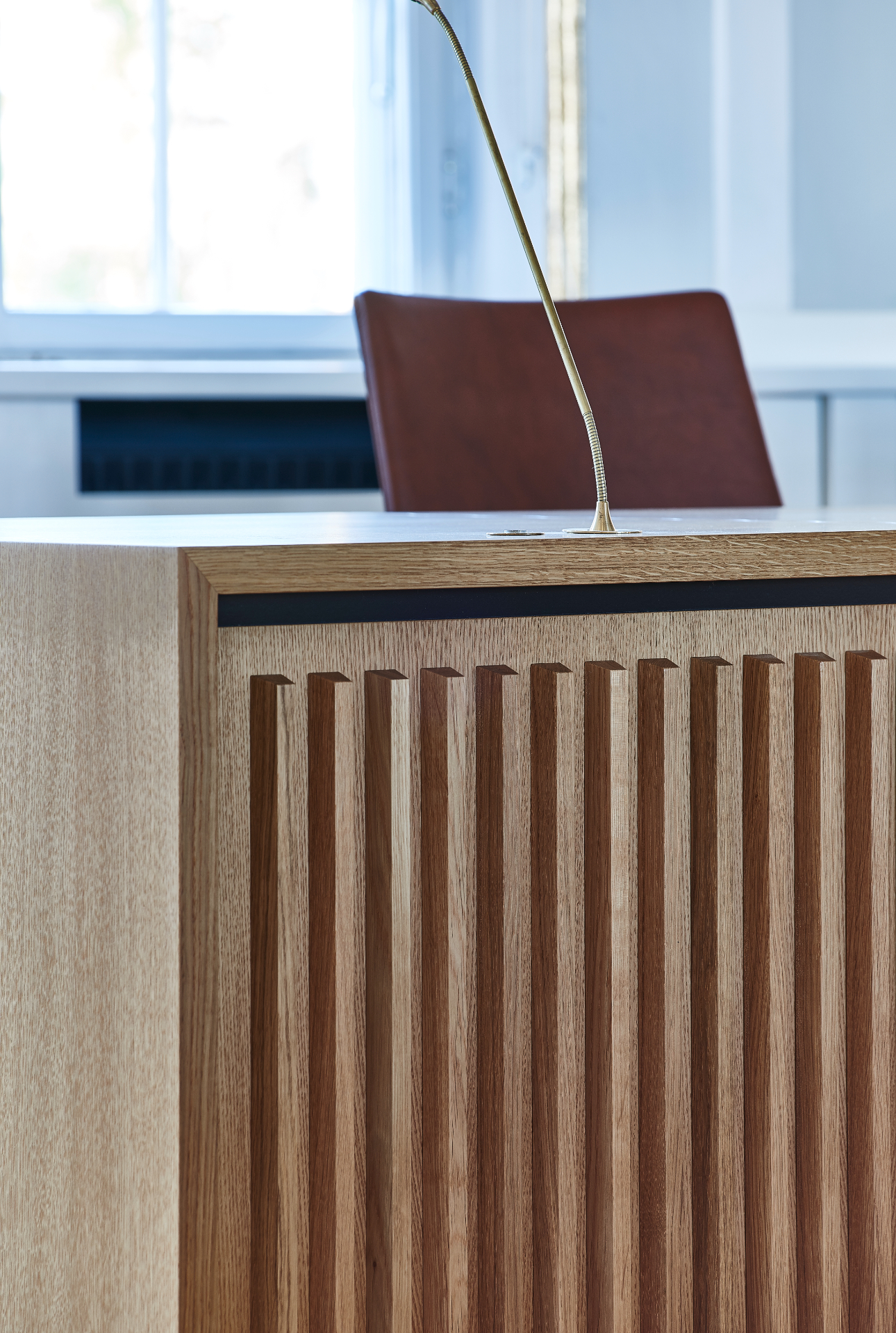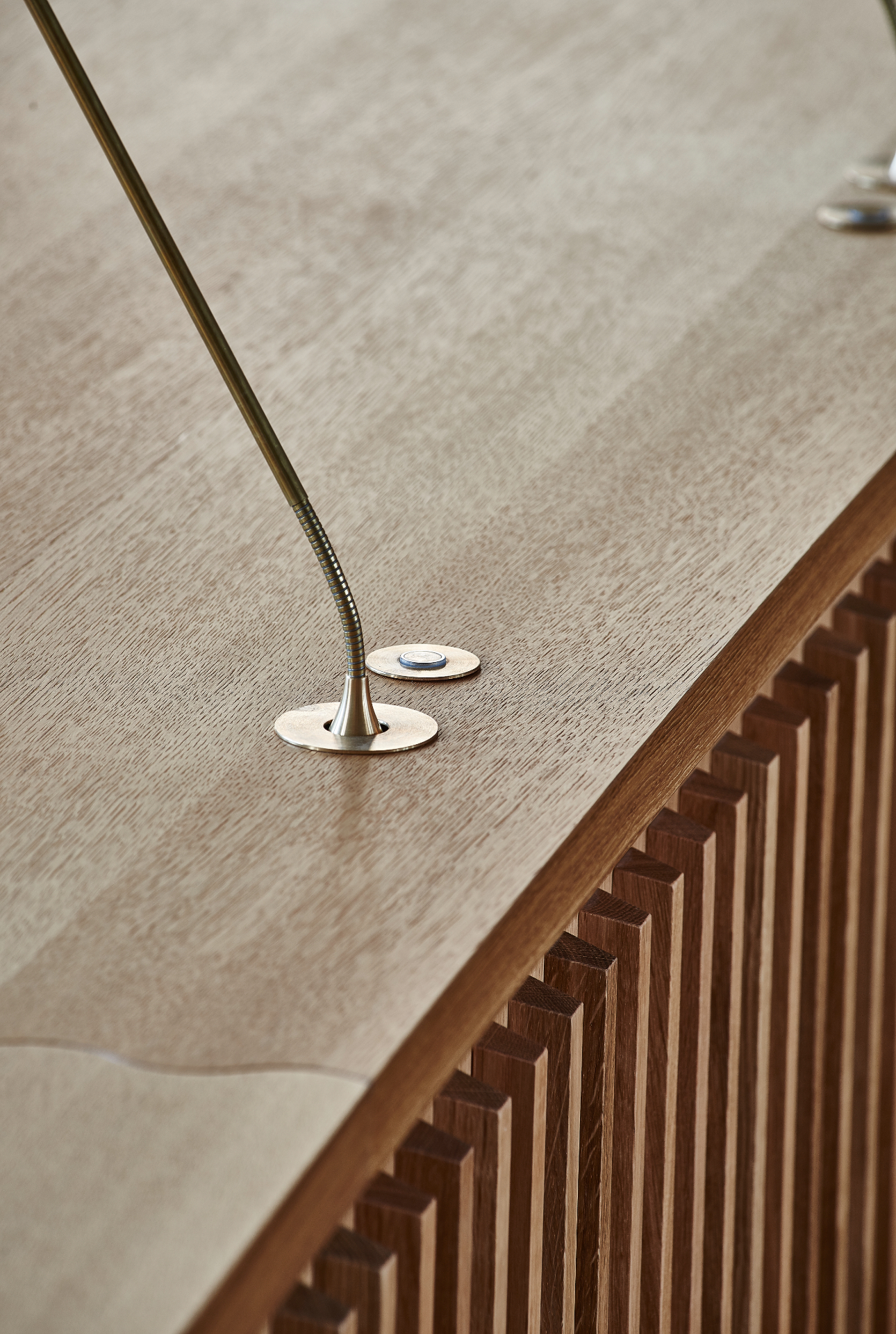 Som en naturlig forlængelse af projektet har vi også fremstillet et mindre, selvstændigt bord i samme stil. Dette bord er dedikeret til pressens repræsentant, der følger og dækker møderne i byrådet.