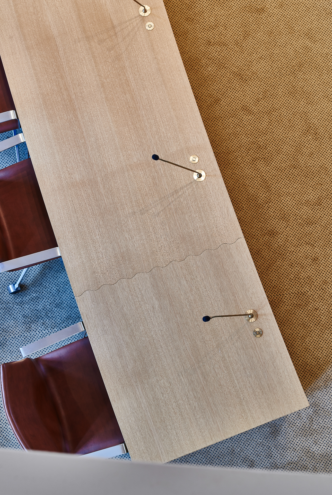 Bordet er inddelt i sektioner med to plader i hver. Dette gør det muligt at justere bordets længde, skulle byrådet på sigt beslutte at reducere antallet af medlemmer. Samlingerne mellem sektionerne er ikke tilfældige – de er formgivet som bølger, inspireret af Vejle Kommunes byvåben, hvor to slyngede linjer symboliserer Vejle Å, der løber gennem byen.