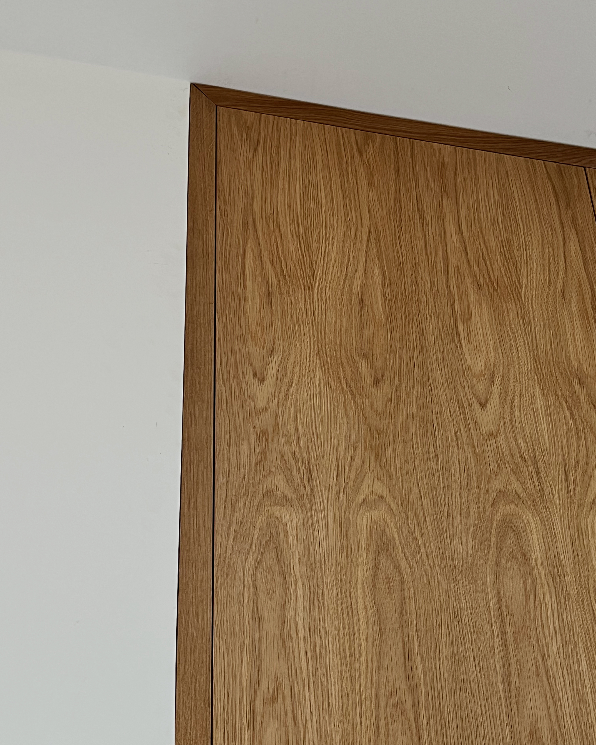 Skabet følger loftets hældning og er indrammet af en kraftig massiv egetræsliste, som er præcist tilpasset væg og loft. Skabene er udstyret med integreret lys, der tænder ved åbning af lågerne, som har push-to-open funktion. Frontfinéren er udført med gennemgående åretegning