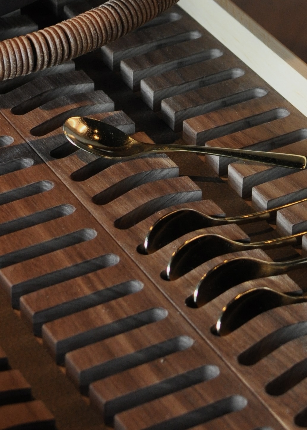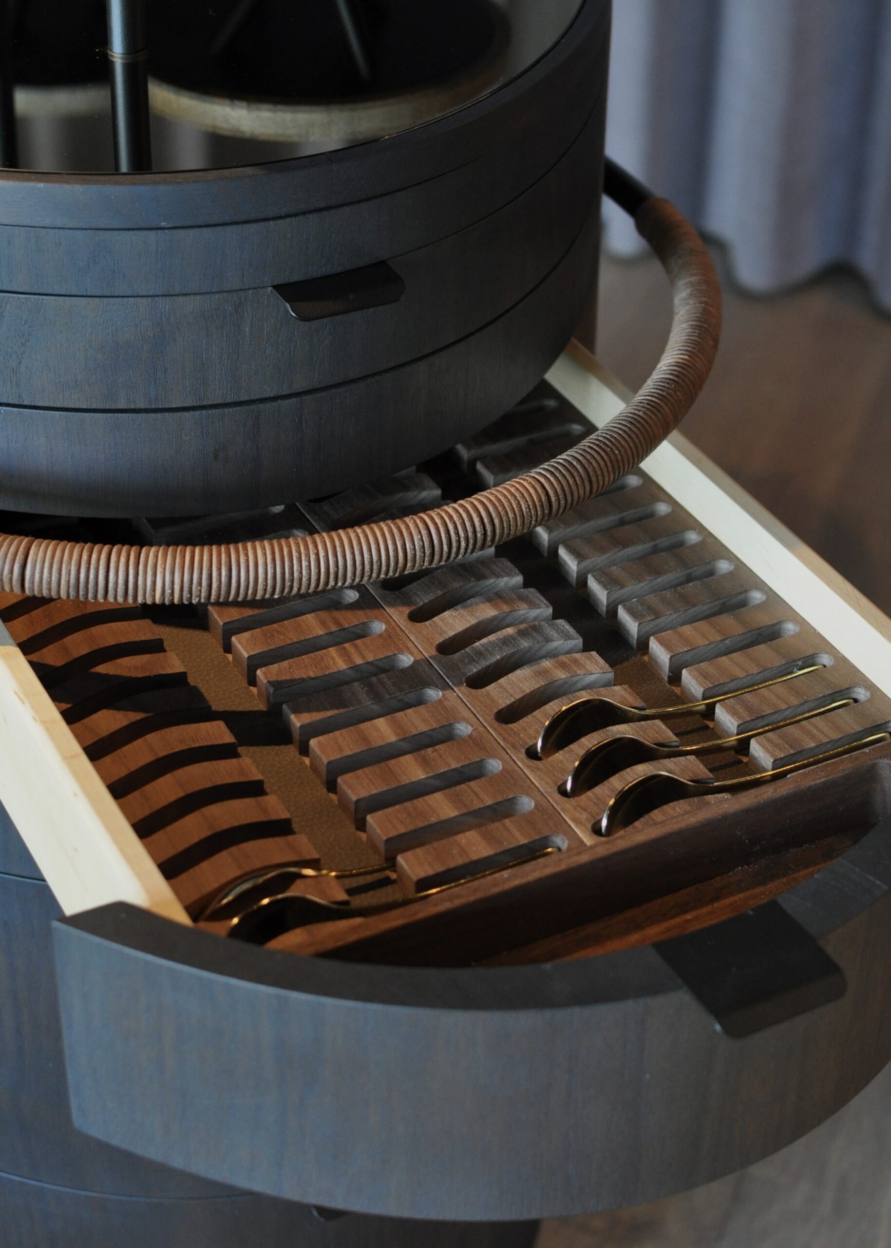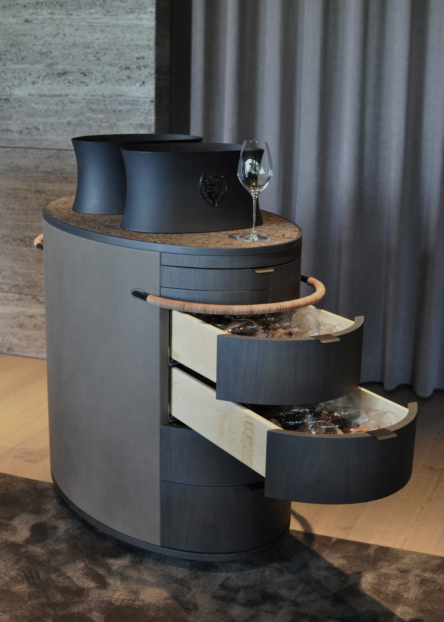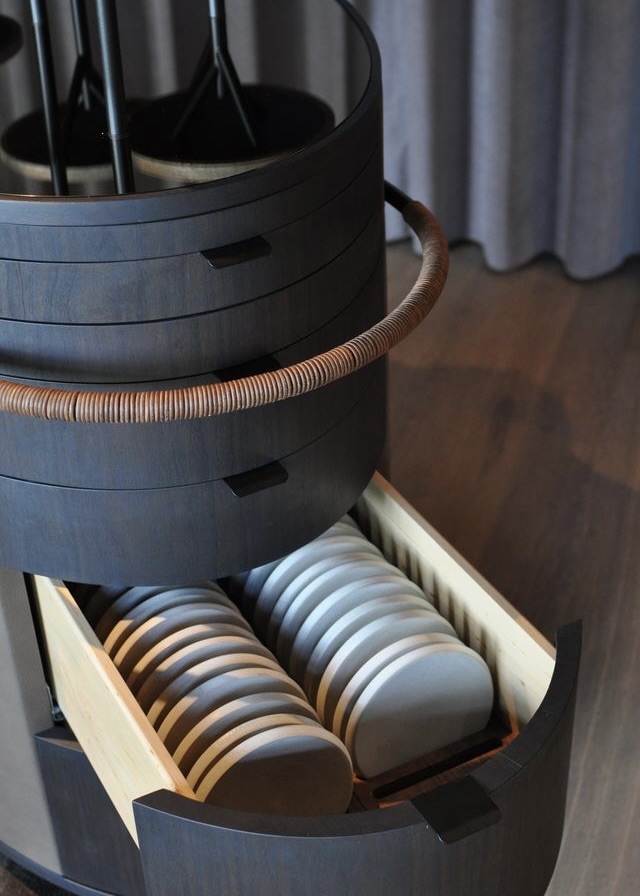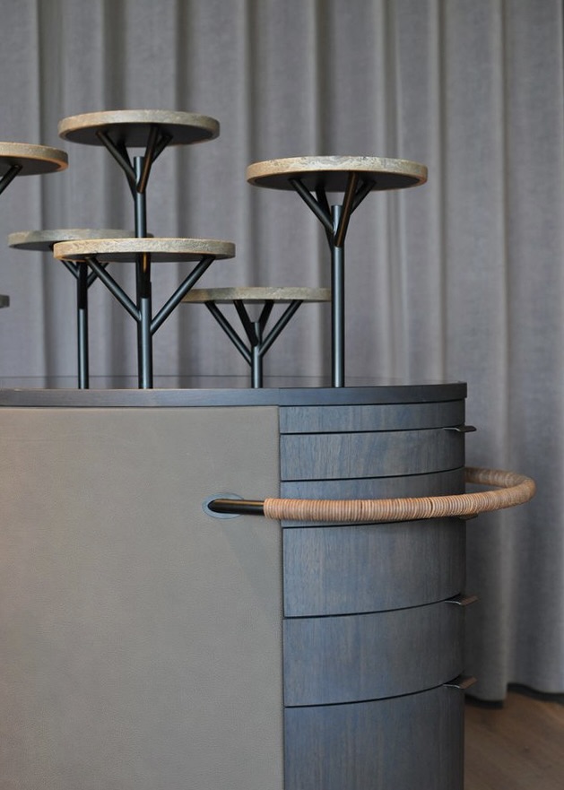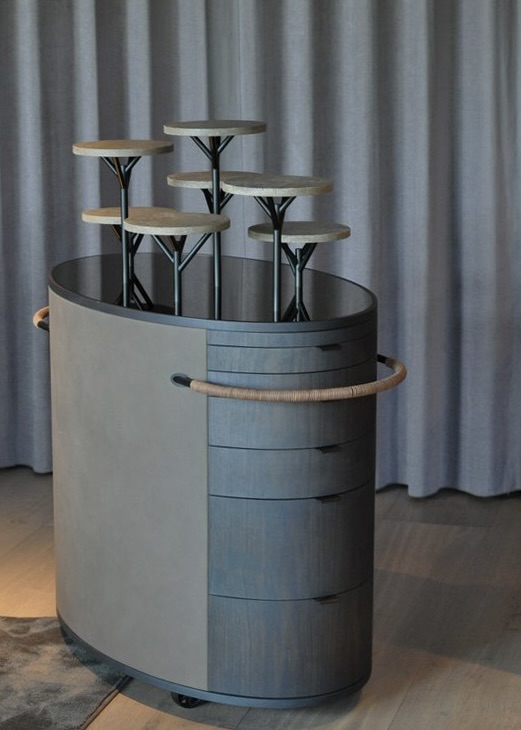Trolleyerne er udført i mørk valnød kombineret med læder. Petit fours-trolleyen er udstyret med en iøjnefaldende top – formet som små “træer”, der rejser sig fra en overflade af broncespejl, og hvor serveringen præsenteres på opsatse i travertin. Dette naturmateriale går igen flere steder i restaurantens nye interiør og skaber en sammenhæng i indretningen.