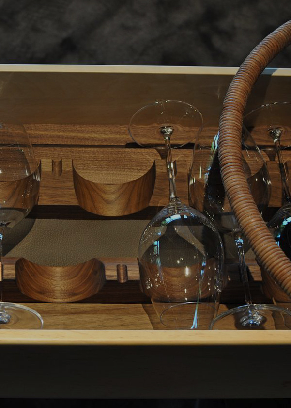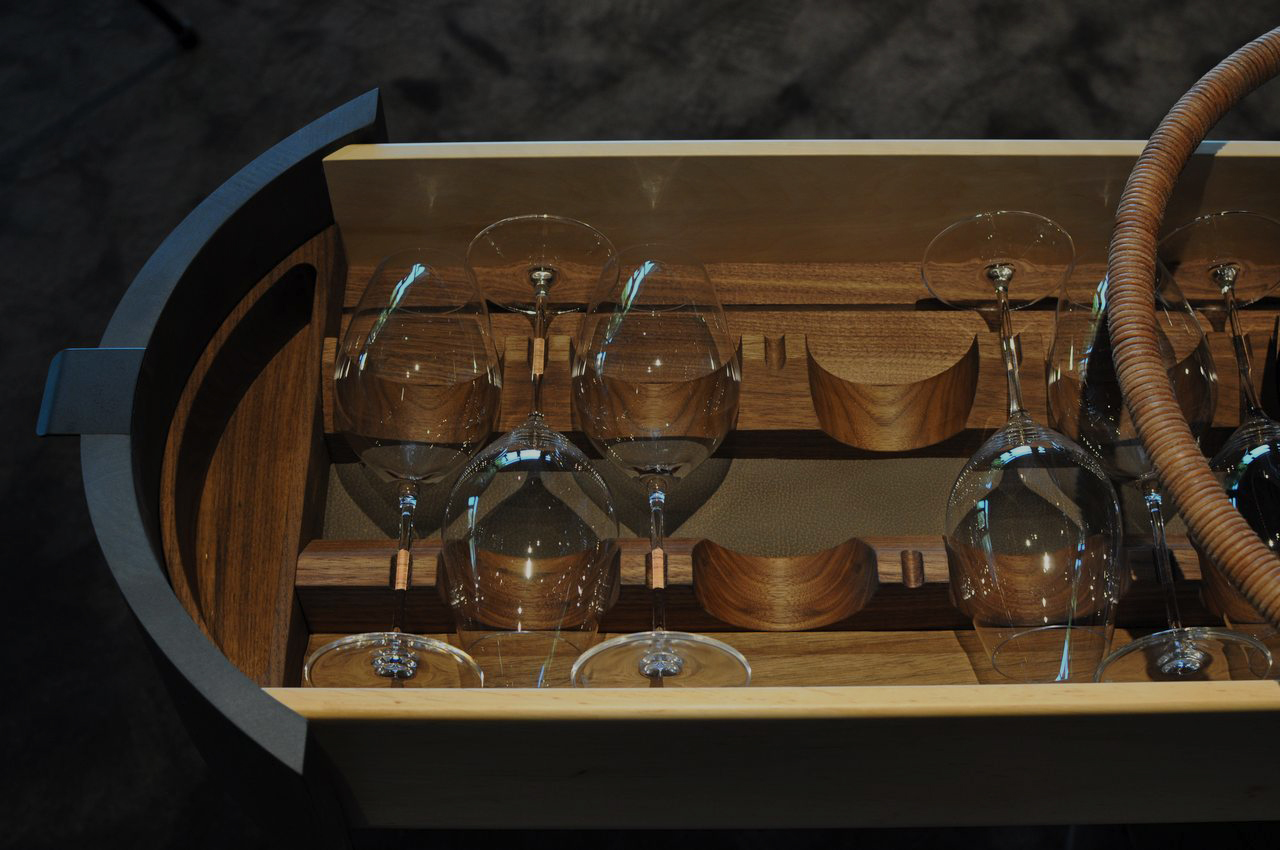 Skufferne, som er fremstillet i rød elletræ, er omhyggeligt udformet med indsatse til service, bestik og i champagnetrolleyen til glas.