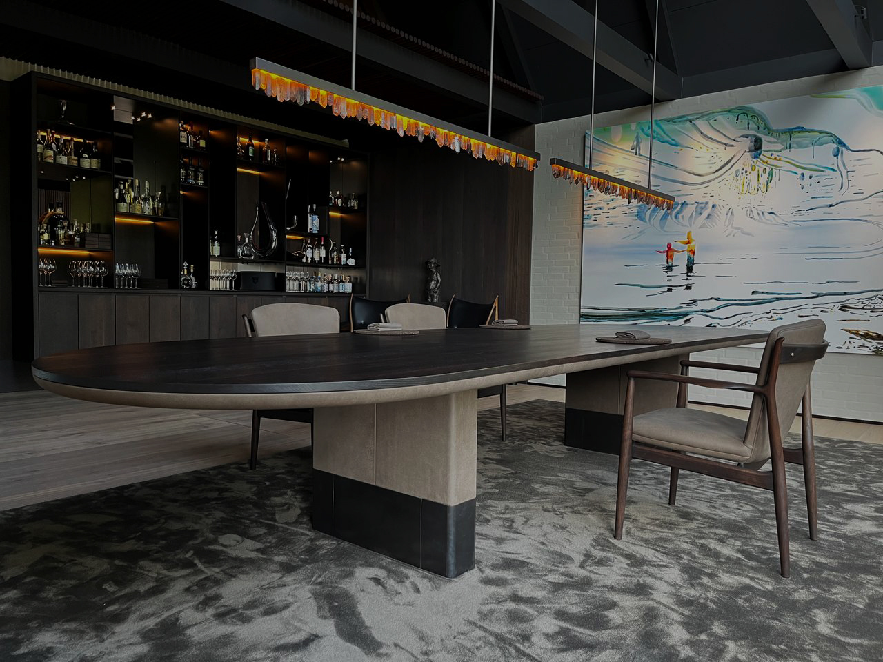 I samme projekt leverede vi – i samarbejde med AP Polstring – også det store bord i restaurantens Private Dining-rum.