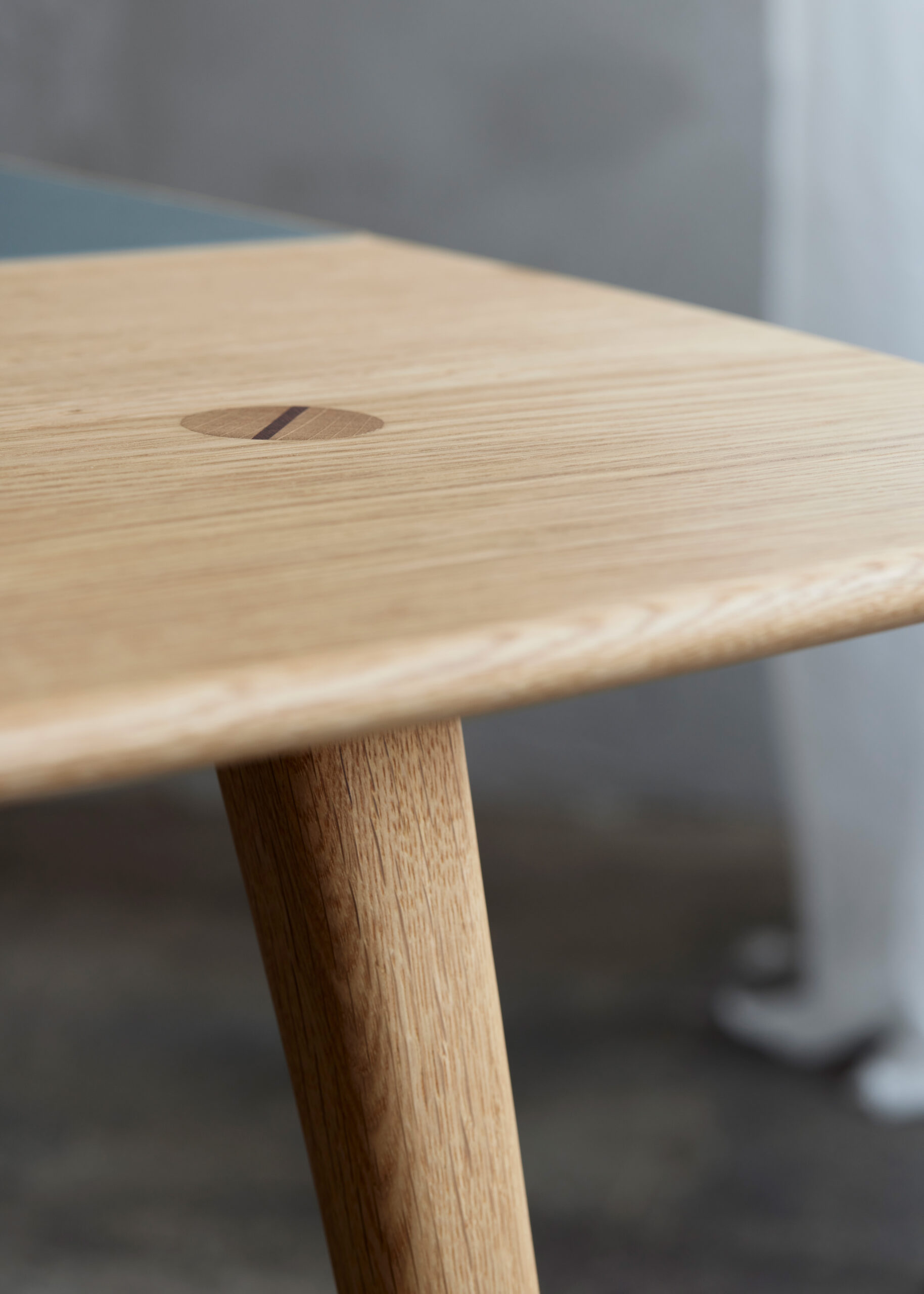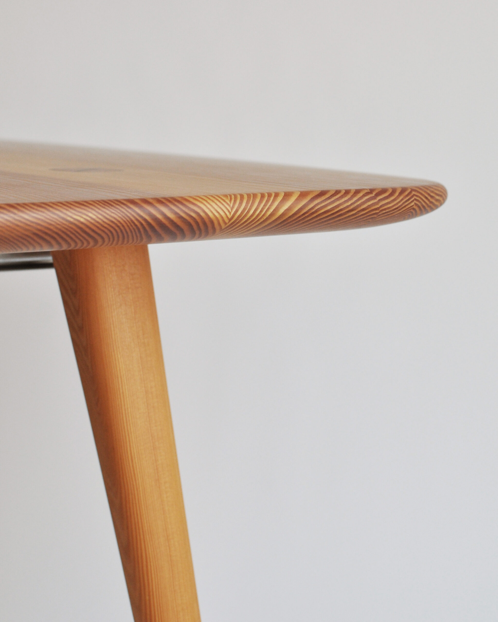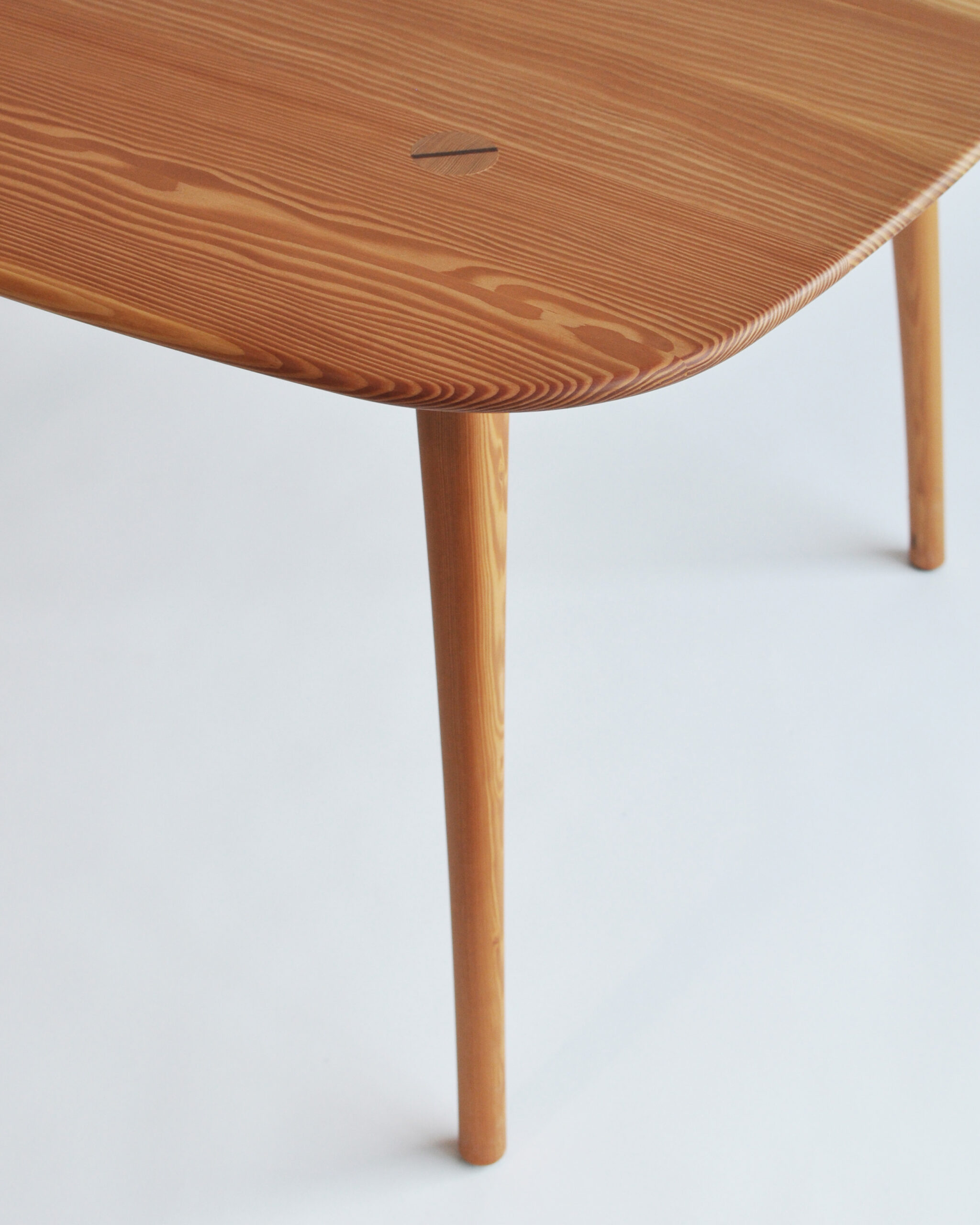 Det særlige ved MK 11 er de svungne ben, som går gennem bordpladen og spændes fast med en synlig kile. En samling der både styrker bordets stabilitet og fremhæver håndværket. Benenes form er let buet og skifter fra rund profil mod gulvet til en mere firkantet form op mod pladen