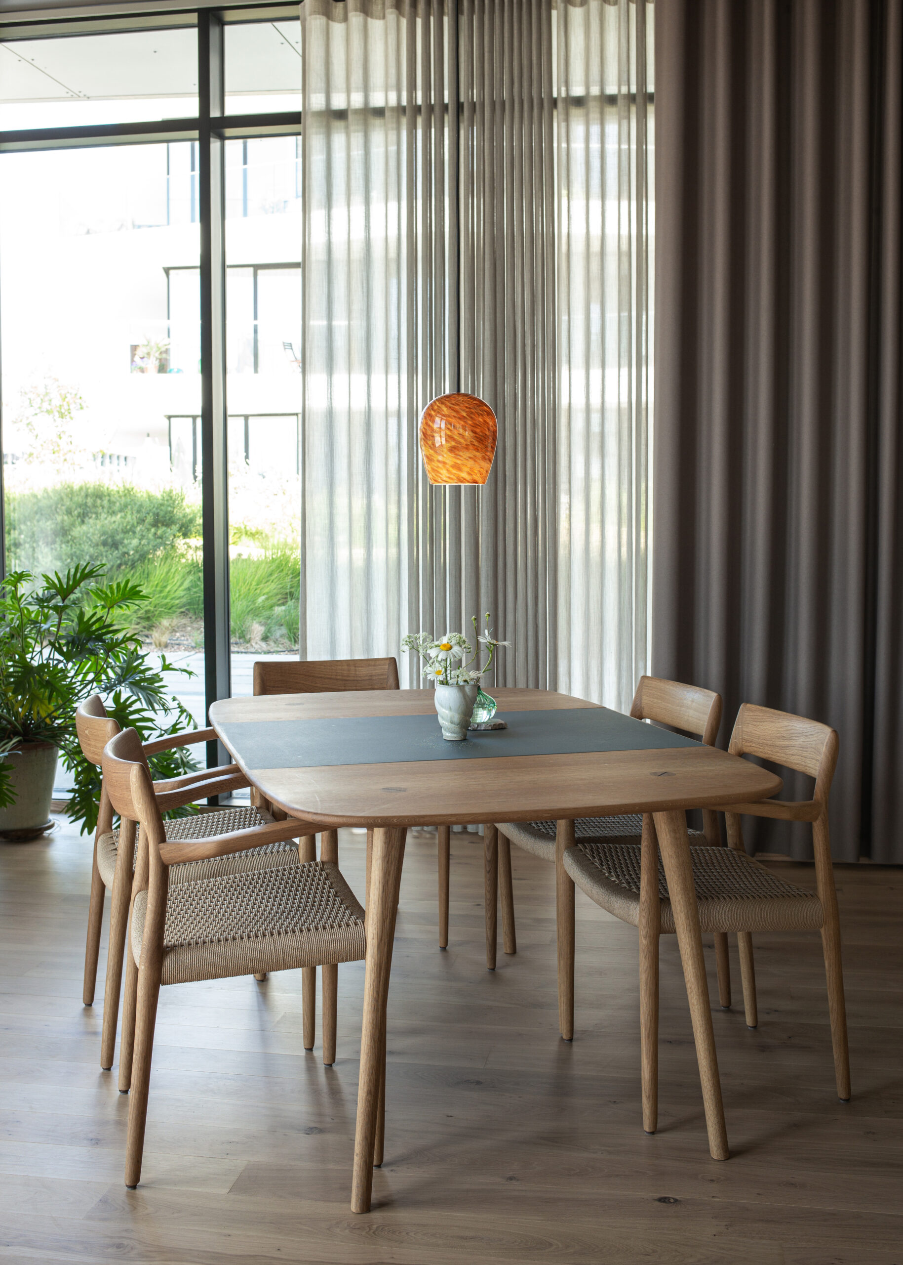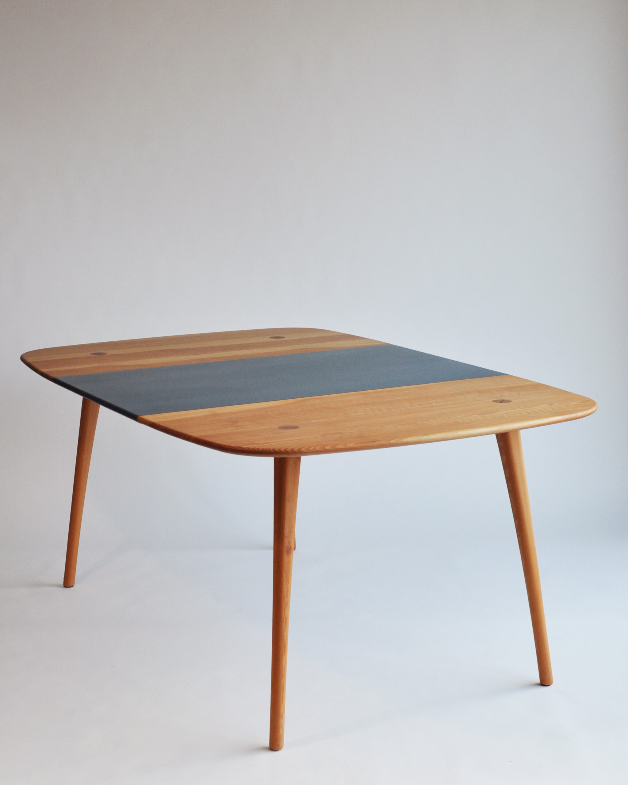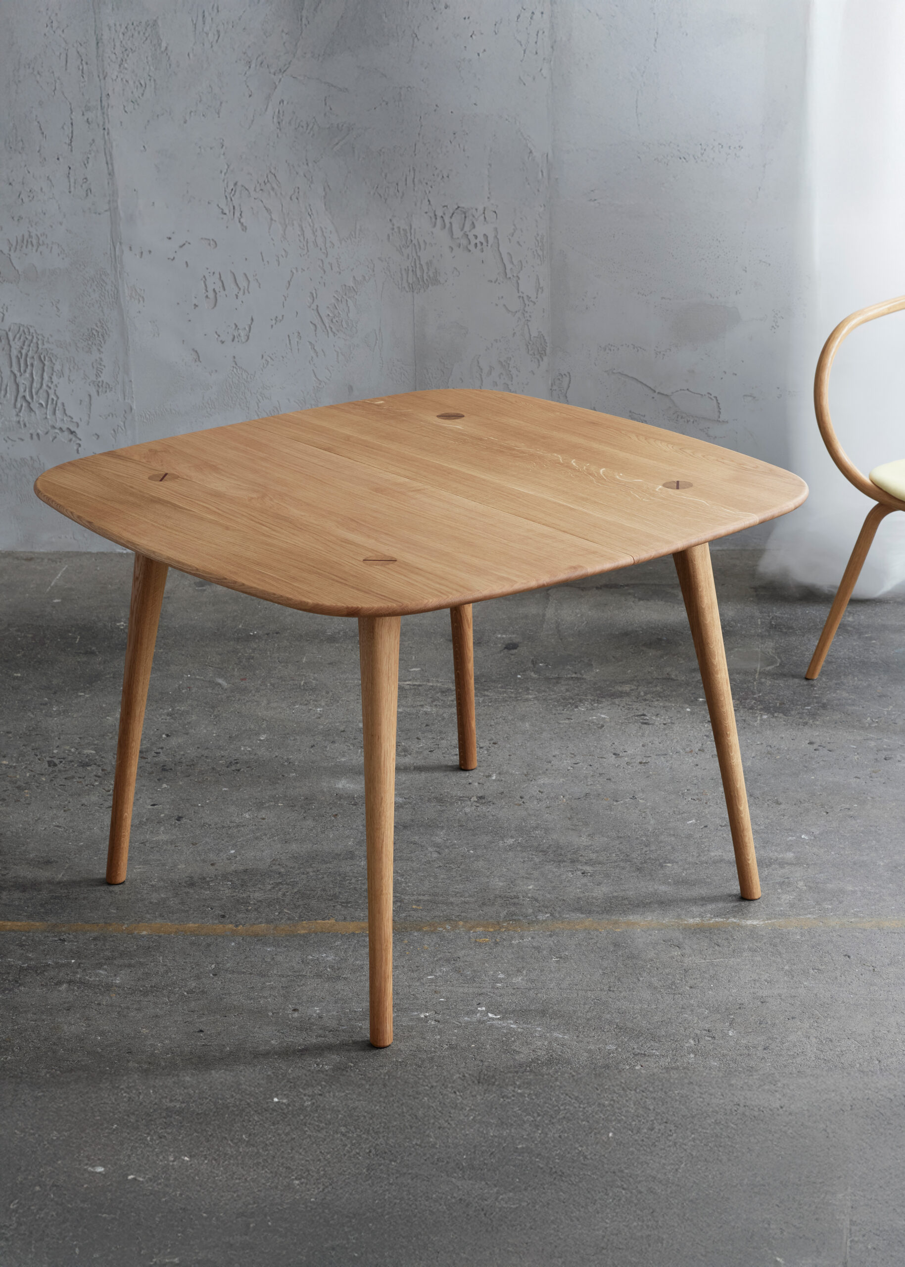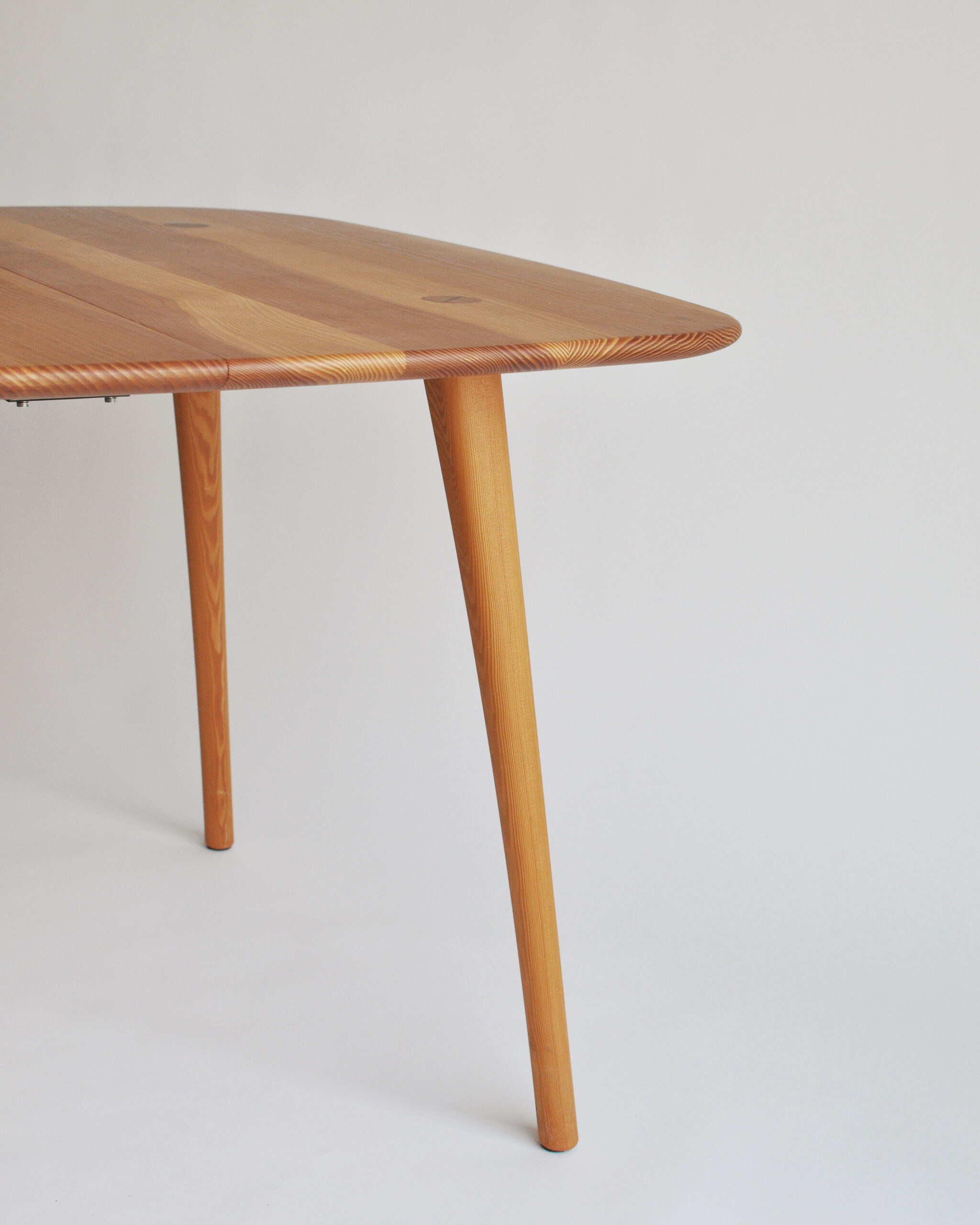 Det særlige ved MK 11 er de svungne ben, som går gennem bordpladen og spændes fast med en synlig kile. En samling der både styrker bordets stabilitet og fremhæver håndværket. Benenes form er let buet og skifter fra rund profil mod gulvet til en mere firkantet form op mod pladen